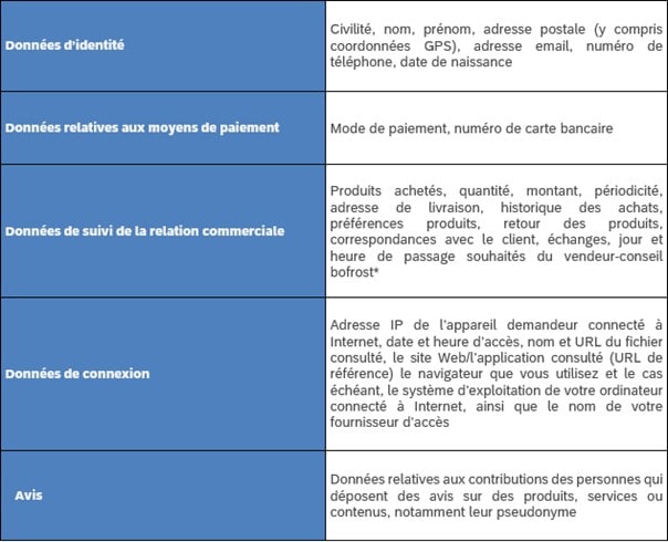 Um Ihnen eine einfache und bequeme Bezahlung Ihrer Bestellung per SEPA-Lastschrift zu ermöglichen, bieten wir Ihnen die „bofrost*Kundenkarte“ an. Hierfür ist es erforderlich folgende Daten des Kontoinhabers zu erheben: Vorname, Nachname, Anschrift, Geburtsdatum, Bankverbindung. Die Daten werden zum Zwecke des Einzuges der Forderung an unser Kreditinstitut weitergegeben. Die Verarbeitung erfolgt ausschließlich auf Grundlage Ihrer Einwilligung gemäß Artikel 6 Absatz 1 Buchstabe a) DSGVO, die Sie jederzeit kostenfrei mit Wirkung für die Zukunft widerrufen können. Details können zu den Allgemeinen Geschäftsbedingungen für die Verwendung der bofrost*Kundenkarte erhalten Sie von Ihrem Verkaufsfahrer.